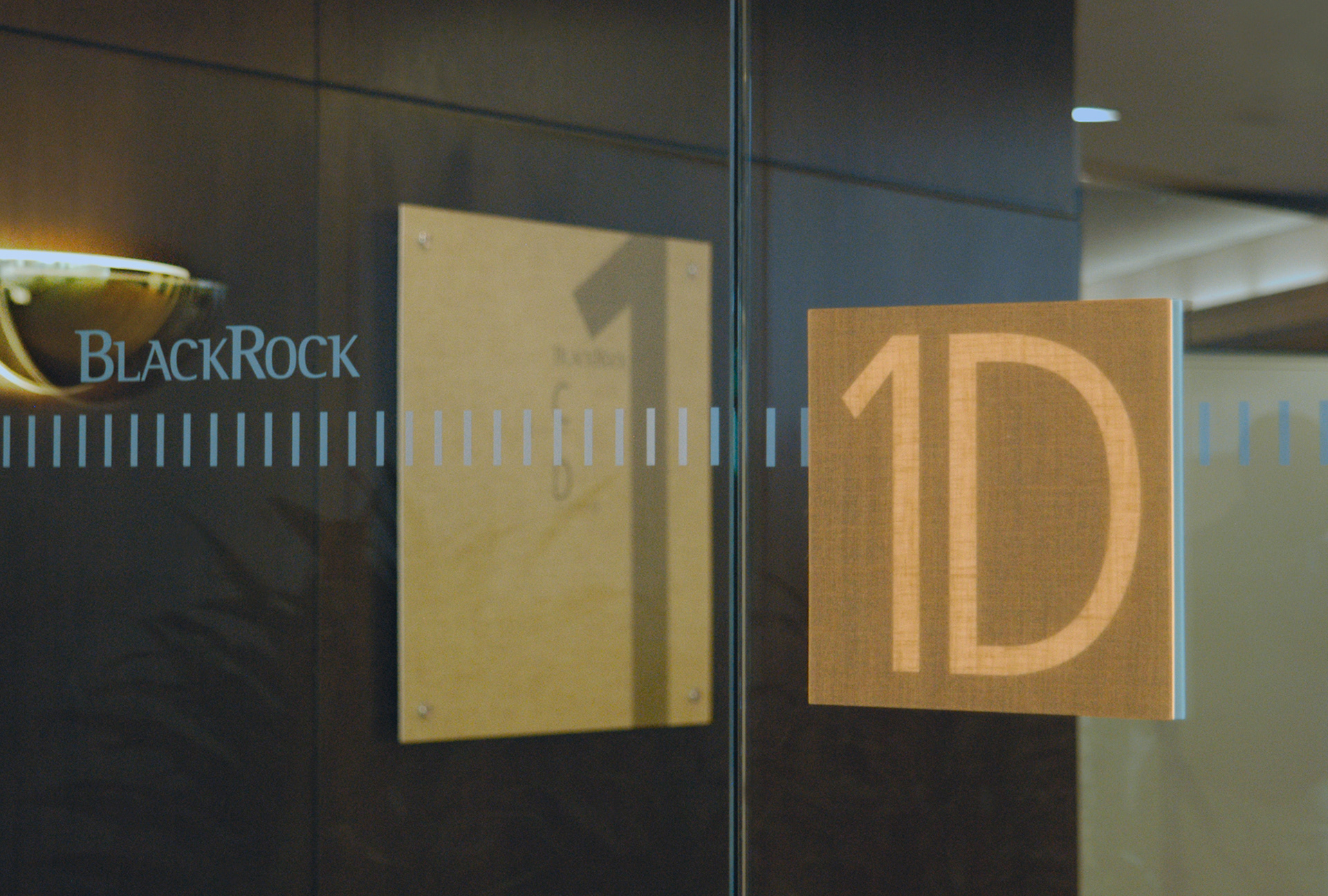 BlackRock identity signage in an elevator lobby in New York City, looking into a reception area. The letterforms used in these applications were typically solid: brushed stainless steel with a pin mount. The effect gave a little visual softening and a slight cast shadow.