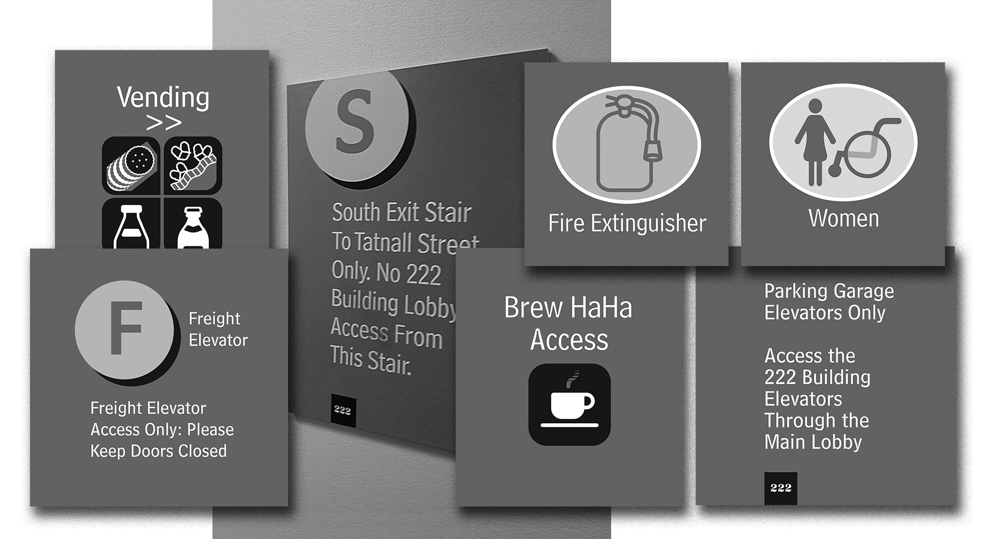 BlackRock needed a solution for something as simple but necessary as a clear and fast read on WC locations. Not wanting to have a ninety degree flag bisecting lines of sight, I designed this. The symbols and icon development for BlackRock was all unique to them. Frutiger is the principle typeface used throughout this system.