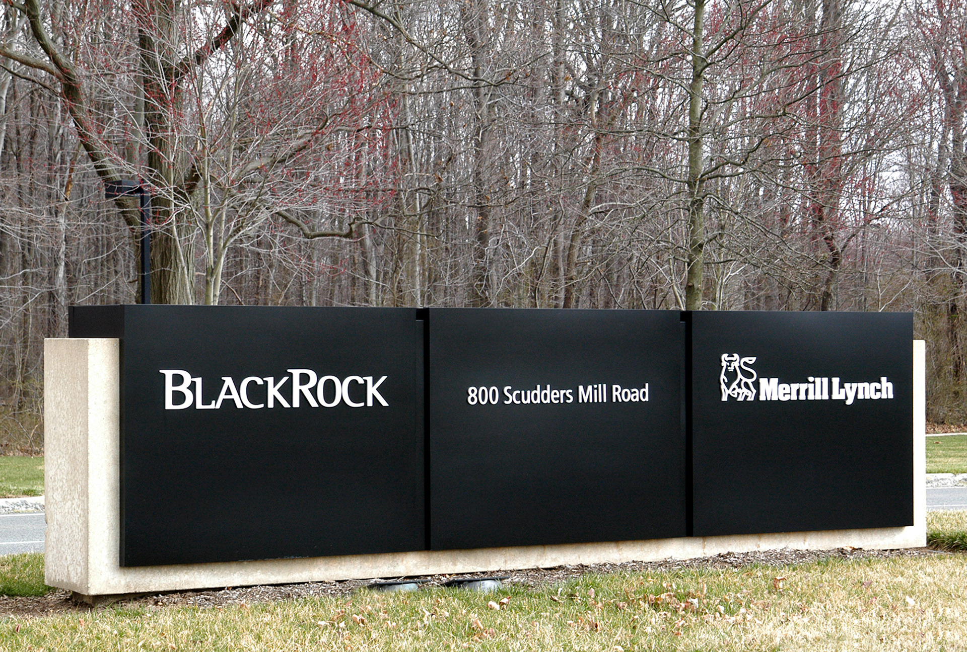 BlackRock's NJ property included monument naming rights for this site. The concept was to cap the existing signage with this metal device. Compass Signs of Bensalem, PA fabricated the boxing structure, covered it with an aircraft grade paint to resist fading and pin mounted the visuals.