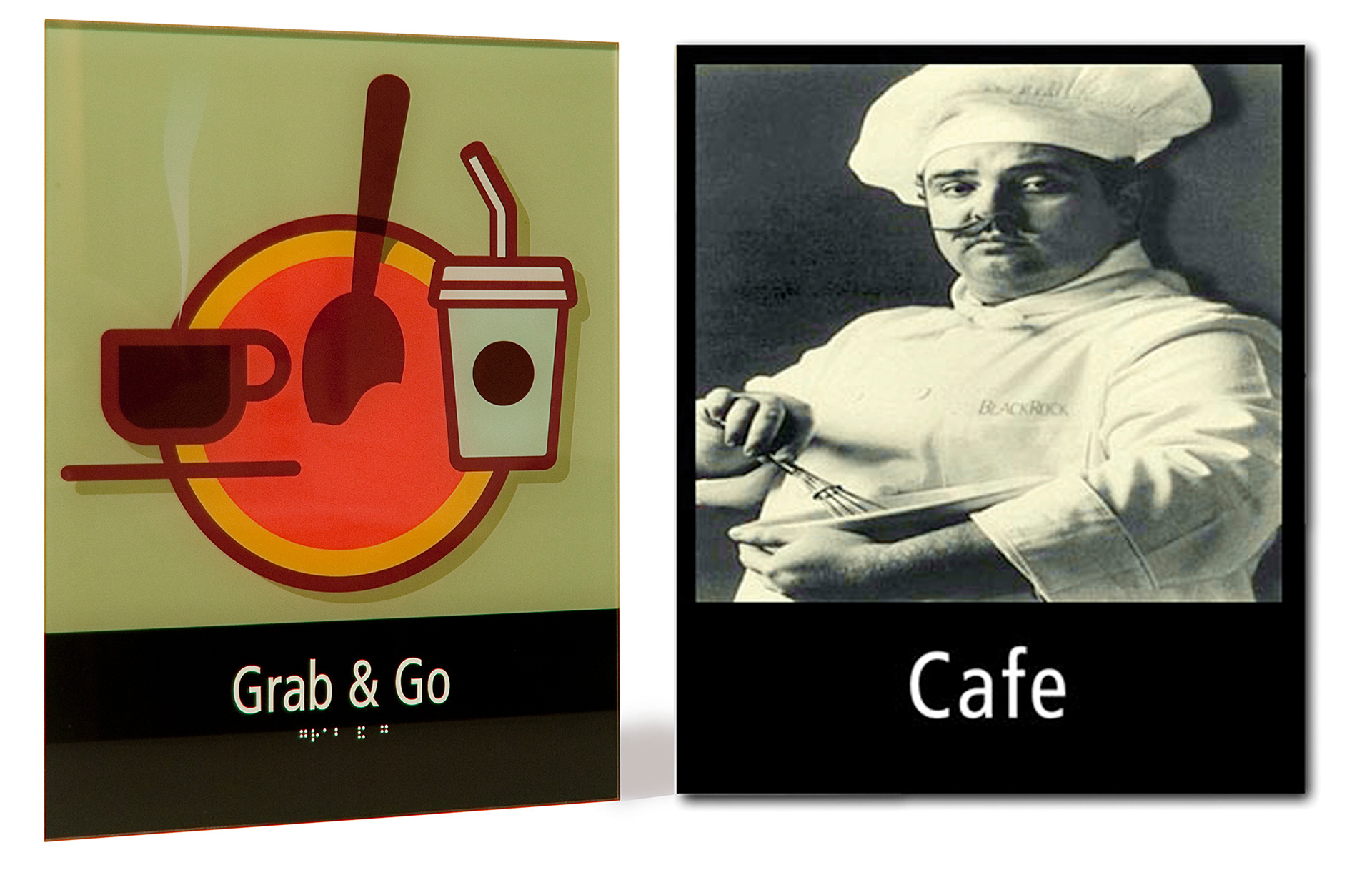 BlackRock asked for some more whimsical visuals for in-house eating options. The Grab & Go was reverse printed on an acrylic panel with surface mounted ADA complaint type and Braille. The Cafe sign was fabricated using fired porcelain from Winsor-Fireform for a timeless look.