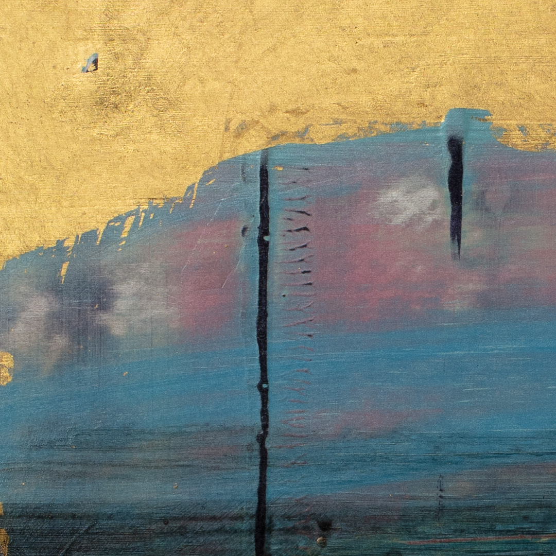Blue Cloud, Golden Sky, 2017-2022. Acrylic and mediums and 23 carat gold leaf on wood panel. 20 inches wide by 16 inches tall by 1 inch deep.