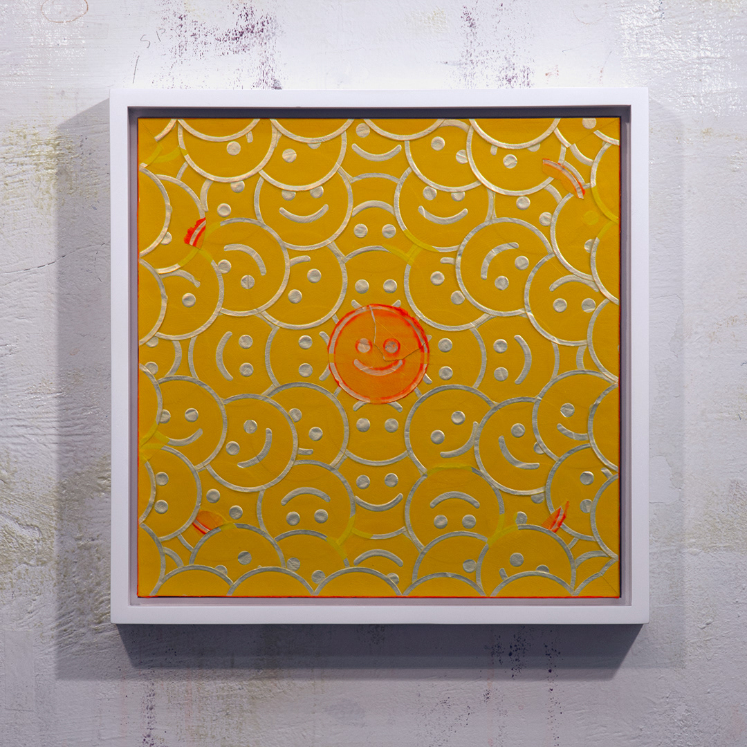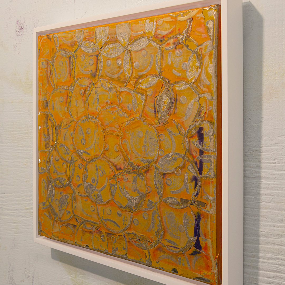 YOLO, 2021. Acrylic and mixed mediums over embossed litho foils on primed masonite support. The group measures 13.5" tall x 58.5" wide x 2.5" deep. You Only Live Once represents the final work of the Smiley Series. Each individual panel measures 8 inches square, is mounted to float on a panel painted with iridescent, soft yellow. The inside of each floater frame is painted to match, the edges are gently distressed. Each YOLO work uses the same shimmering yellow and fluorescent orange to complement the silver foil of the offset litho applied to the Smiley stickers. The work is for sale as a set. $2500.00 plus insured shipping, delivery is free to local Wilmington area.